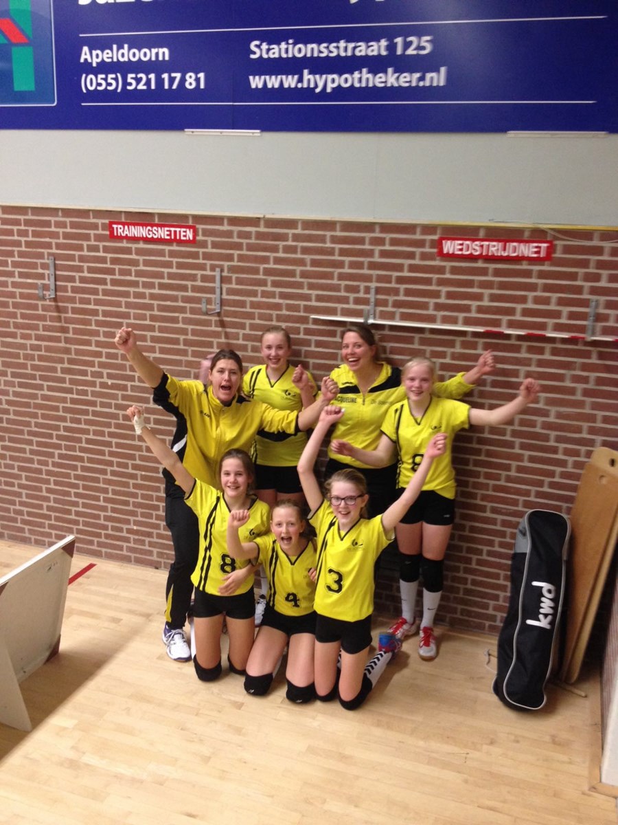 Het moest gebeuren in de wedstrijd tegen DOK. Dit team had al 2 westrijden met 2-0 gewonnen. Winst in deze partij betekende winst in de poule. De meiden speelden echt een dijk van een wedstrijd. Verdedigend werd alles gepakt. En de aanval was heel sterk. Ook was de servicedruk groot. De tegenstander werd met 27-25 en 25-18 verslagen. Hierdoor waren we 1ste in de poule!!
